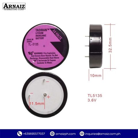 The Tadiran TL-5135 is a 3.6V 1700mAh lithium-thionyl chloride battery built for non-rechargeable applications. Its compact design (diameter 32.9mm � height 11.0mm) provides high energy density and consistent voltage output. Ideal for industrial devices, memory backup systems, sensors, and professional equipment requiring reliable long-term power.