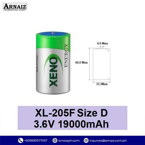 The Xeno XL-205F is a 19000mAh 3.6V primary lithium Size D battery (ER34615) for non-rechargeable applications. It features lithium chemistry for high energy density, compact yet robust design, and reliable performance under extreme conditions. With a diameter of 33.6 mm, height of 60 mm, and weight of 98g, this battery is suitable for industrial, medical, and professional equipment that requires dependable long-term power.